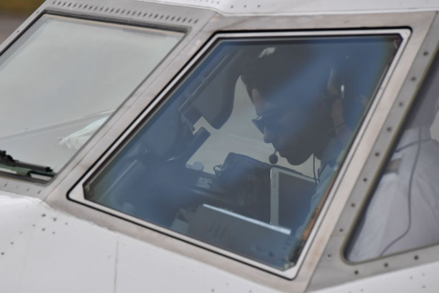 羽田発福岡行き009便に乗務する髙橋機長(手前)とベヒシュタイン副操縦士=18年4月6日 PHOTO: Tadayuki YOSHIKAWA/Aviation Wire
