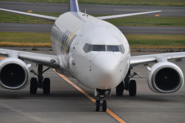髙橋機長とベヒシュタイン副操縦士が乗務し羽田に到着するスカイマークの福岡発012便=18年4月6日 PHOTO: Tadayuki YOSHIKAWA/Aviation Wire