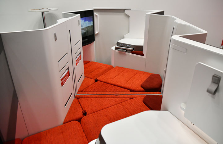 ジャムコがハンブルクで初公開した中央席がダブルベッド状になるビジネスクラスシートのコンセプトモデル=18年4月11日 PHOTO: Tadayuki YOSHIKAWA/Aviation Wire