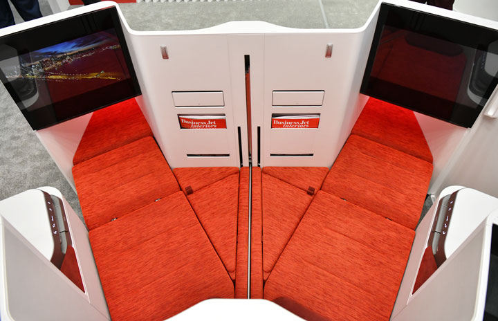 ジャムコがハンブルクで初公開した中央席がダブルベッド状になるビジネスクラスシートのコンセプトモデル=18年4月11日 PHOTO: Tadayuki YOSHIKAWA/Aviation Wire