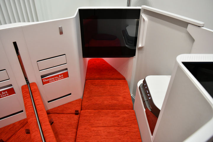 パーティションと通路側のドアで個室感を高められるジャムコがハンブルクで初公開したビジネスクラスシートのコンセプトモデル=18年4月11日 PHOTO: Tadayuki YOSHIKAWA/Aviation Wire