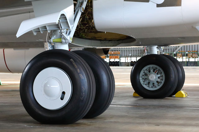 スカイマークが破綻後初めて受領した737-800「JA73AA」の主脚=18年8月15日 PHOTO: Masahiro SATO/Aviation Wire