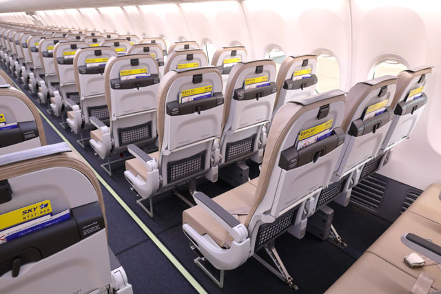 スカイマークが破綻後初めて受領した737-800「JA73AA」のシート=18年8月15日 PHOTO: Masahiro SATO/Aviation Wire