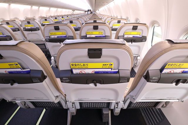 スカイマークが破綻後初めて受領した737-800「JA73AA」のシート=18年8月15日 PHOTO: Masahiro SATO/Aviation Wire