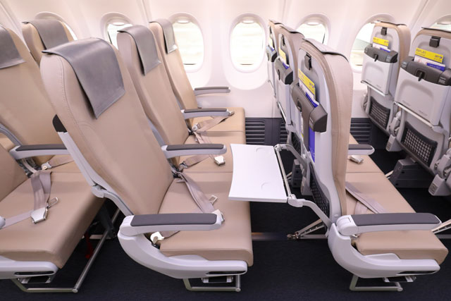 テーブルを出した状態にしたスカイマークの737-800「JA73AA」=18年8月15日 PHOTO: Masahiro SATO/Aviation Wire