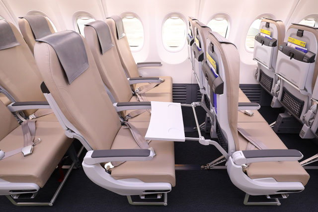 テーブルを引き出した状態にしたスカイマークの737-800「JA73AA」=18年8月15日 PHOTO: Masahiro SATO/Aviation Wire