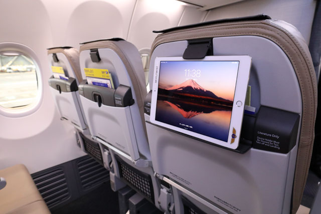スカイマークが破綻後初めて受領した737-800「JA73AA」に設けられたタブレットホルダーに置かれたiPad=18年8月15日 PHOTO: Masahiro SATO/Aviation Wire