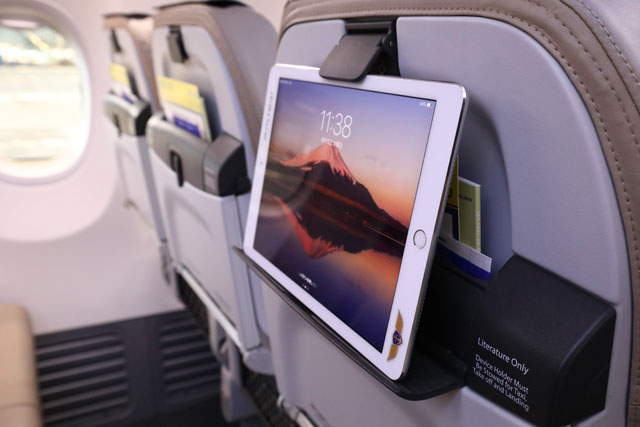 スカイマークが破綻後初めて受領した737-800「JA73AA」に設けられたタブレットホルダーに置かれたiPad=18年8月15日 PHOTO: Masahiro SATO/Aviation Wire