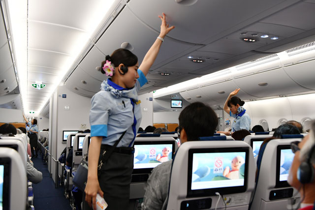 ANAのA380初便ホノルル行きNH184便の出発時にオーバーヘッドビンを点検する客室乗務員=19年5月24日 PHOTO: Tadayuki YOSHIKAWA/Aviation Wire