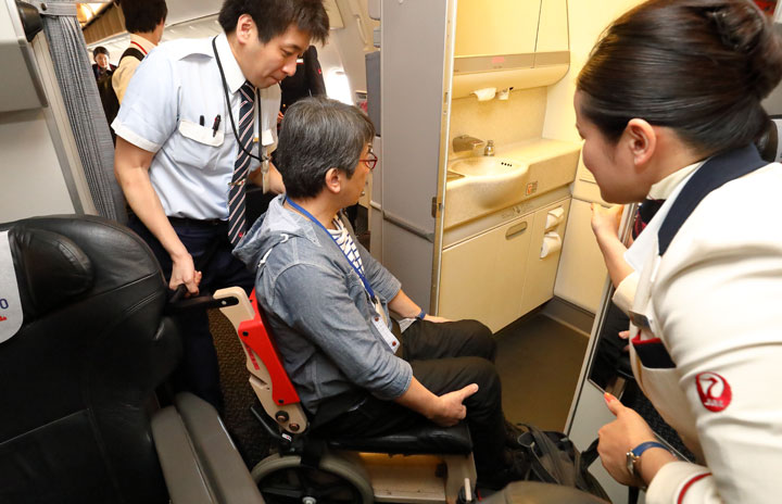 JALが羽田空港で開催した空港体験プログラムでスペースが広い化粧室の説明を聞く参加者=19年5月25日 PHOTO: Masahiro SATO/Aviation Wire