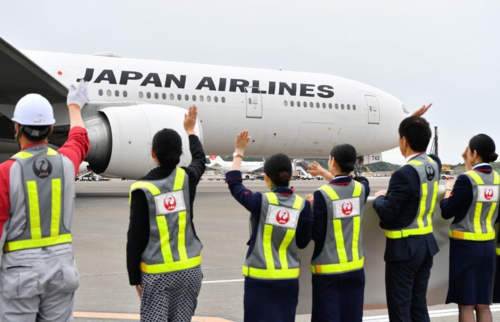 成田空港を出発するロサンゼルス行きJL62便を見送るJAL社員ら=19年5月28日 PHOTO: Tadayuki YOSHIKAWA/Aviation Wire