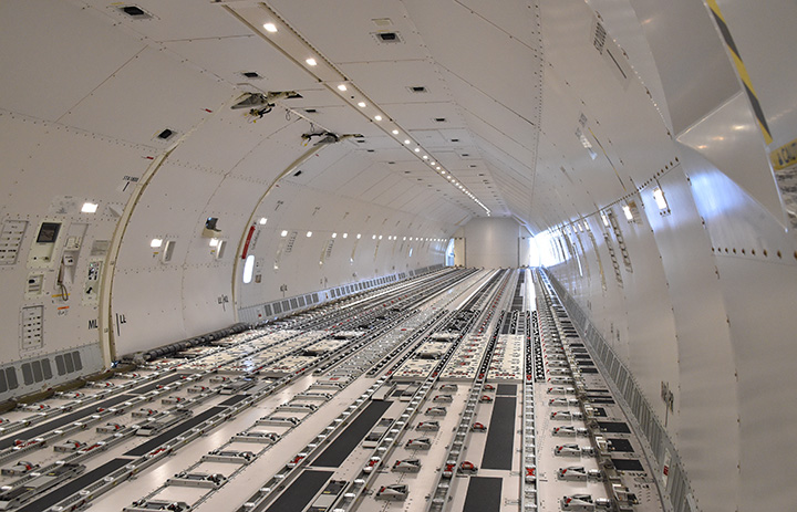 ANAカーゴ777Fの機体後方から見た貨物室=19年6月13日 PHOTO: Yusuke KOHASE/Aviation Wire