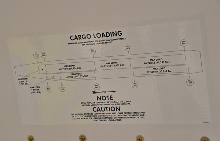 ANAカーゴ777Fの貨物扉横に示す貨物配置図=19年6月13日 PHOTO: Yusuke KOHASE/Aviation Wire
