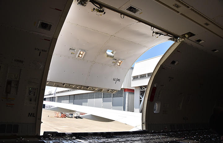 ANAカーゴ777Fの機内から見た貨物扉=19年6月13日 PHOTO: Yusuke KOHASE/Aviation Wire