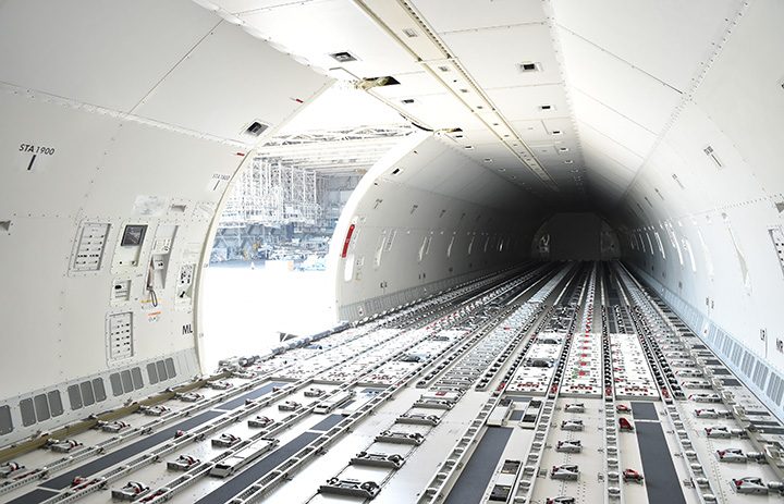 貨物扉が開いたANAカーゴ777Fの機内=19年6月13日 PHOTO: Yusuke KOHASE/Aviation Wire