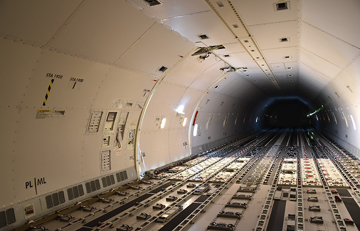 貨物扉が閉まるANAカーゴ777Fの機内=19年6月13日 PHOTO: Yusuke KOHASE/Aviation Wire