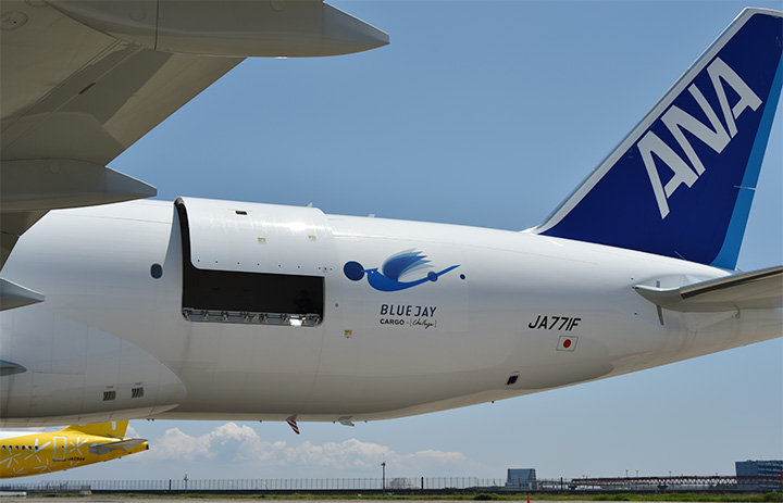 貨物室の扉が開くANAカーゴの777F初号機=19年6月13日 PHOTO: Yusuke KOHASE/Aviation Wire
