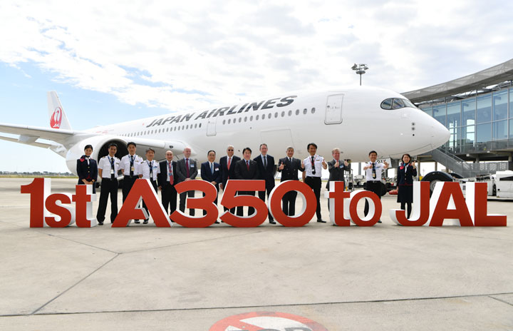 トゥールーズで開かれたJALのA350納入式典で記念撮影する植木会長ら=19年6月13日 PHOTO: Tadayuki YOSHIKAWA/Aviation Wire