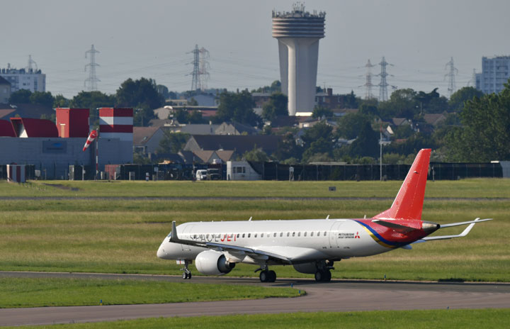 パリ航空ショー出展を終えル・ブルジェ空港の滑走路へ向かう三菱スペースジェットの飛行試験3号機=19年6月18日 PHOTO: Tadayuki YOSHIKAWA/Aviation Wire