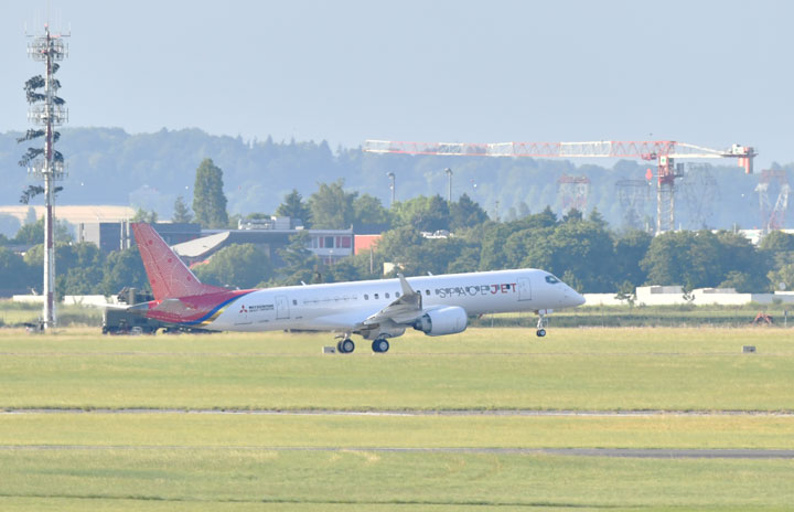 パリ航空ショー出展を終えル・ブルジェ空港を離陸する三菱スペースジェットの飛行試験3号機=19年6月18日 PHOTO: Tadayuki YOSHIKAWA/Aviation Wire