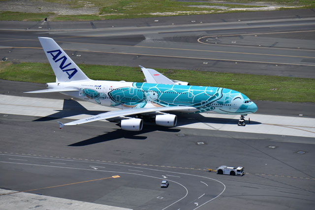 ホノルルのダニエル・K・イノウエ空港でトーイングカーが外されたANAのA380 2号機NH183便=19年7月2日 PHOTO: Tadayuki YOSHIKAWA/Aviation Wire