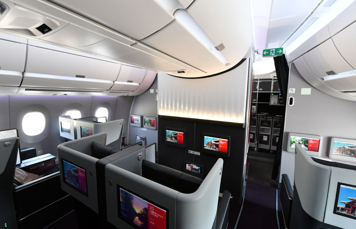 福岡空港で公開されたJALのA350-900初号機のファーストクラス=19年8月1日 PHOTO: Tadayuki YOSHIKAWA/Aviation Wire