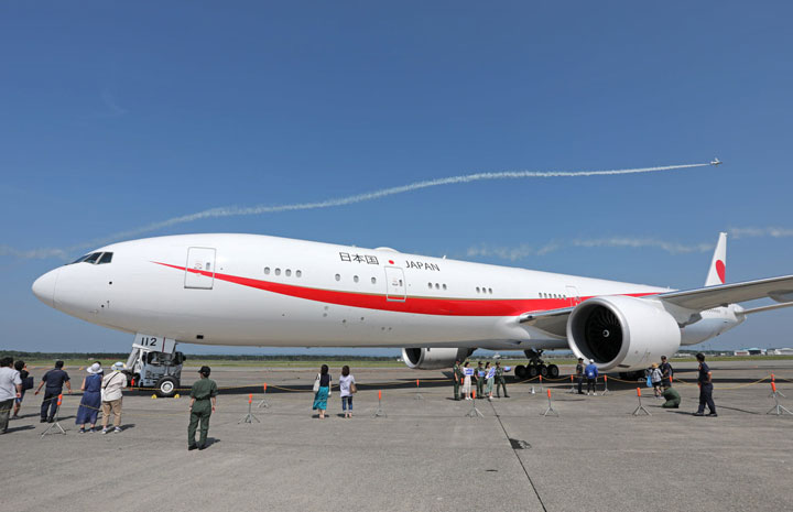 千歳航空祭に初参加した新政府専用機B-777と上空を飛行するブルーインパルスのT-4=19年8月4日 PHOTO: Stringer/Aviation Wire