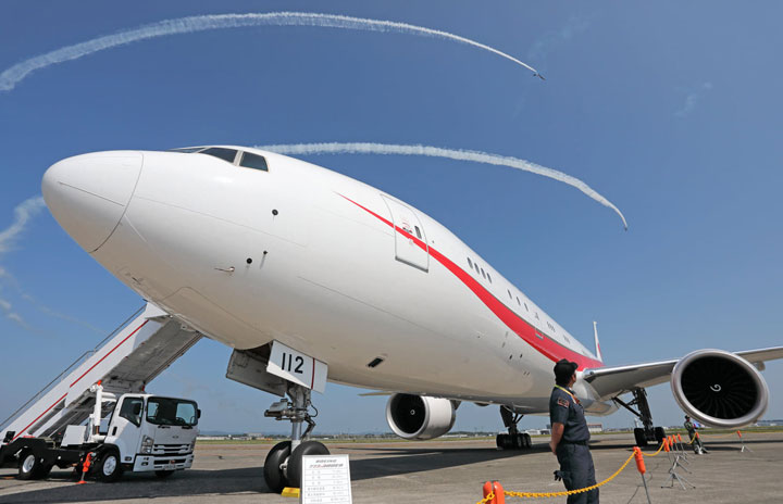 千歳航空祭に初参加した新政府専用機B-777と上空を飛行するブルーインパルスのT-4=19年8月4日 PHOTO: Stringer/Aviation Wire