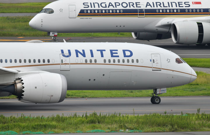 羽田を出発するユナイテッド航空の787-9(下)と着陸するシンガポール航空のA350-900=19年9月21日 PHOTO: Tadayuki YOSHIKAWA/Aviation Wire