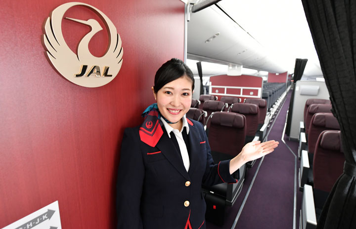 JALの787-8国内線仕様初号機のL2ドア付近に掲げられた黄金の鶴丸ロゴの横で機内を紹介する客室乗務員=19年10月16日 PHOTO: Tadayuki YOSHIKAWA/Aviation Wire