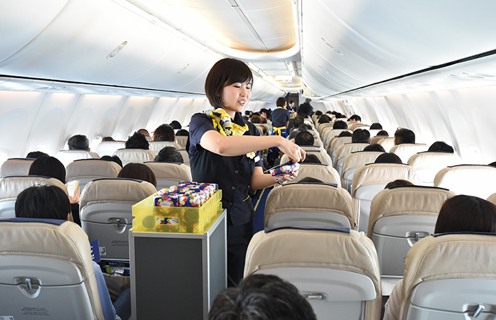 サイパン行き初便の乗客に記念品を手渡すスカイマークの客室乗務員=19年11月29日 PHOTO: Yusuke KOHASE/Aviation Wire