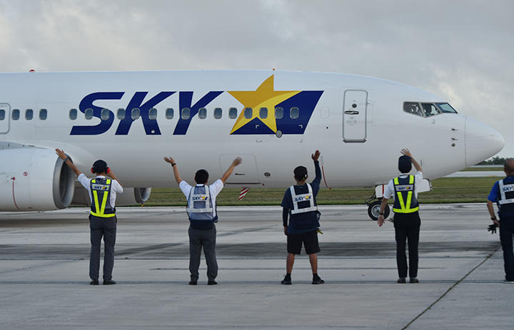 サイパンを出発する成田行きBC816便初便を見送るスカイマークのスタッフ=19年11月29日 PHOTO: Yusuke KOHASE/Aviation Wire