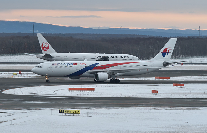 JALの777とマレーシア航空のA330=19年12月16日 PHOTO: Yusuke KOHASE/Aviation Wire