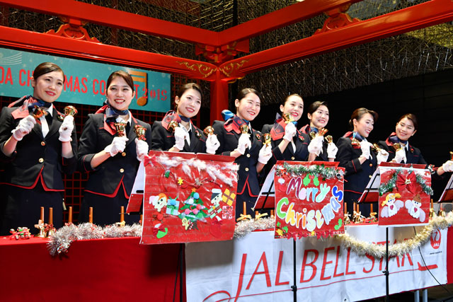 羽田国際線ターミナルでハンドベルを披露するJALベルスターのメンバー=19年12月22日 PHOTO: Tadayuki YOSHIKAWA/Aviation Wire
