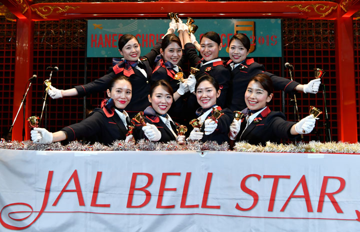 羽田国際線ターミナルでハンドベルを披露したJALベルスターのメンバー=19年12月22日 PHOTO: Tadayuki YOSHIKAWA/Aviation Wire