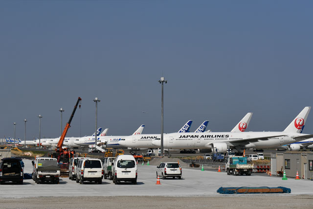 羽田空港に並ぶJALとANAの旅客機=20年4月4日 PHOTO: Tadayuki YOSHIKAWA/Aviation Wire