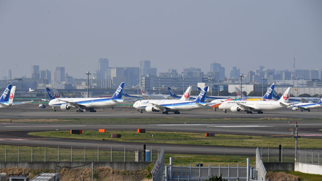 羽田空港に並ぶANAとJALの旅客機=20年4月4日 PHOTO: Tadayuki YOSHIKAWA/Aviation Wire