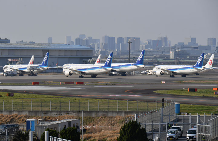 羽田空港に並ぶANAとJALの旅客機=20年4月4日 PHOTO: Tadayuki YOSHIKAWA/Aviation Wire