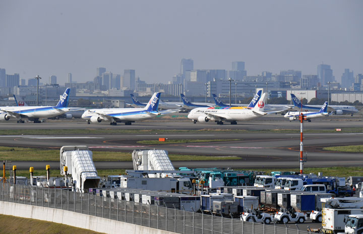 羽田空港に並ぶANAとJALの旅客機=20年4月4日 PHOTO: Tadayuki YOSHIKAWA/Aviation Wire