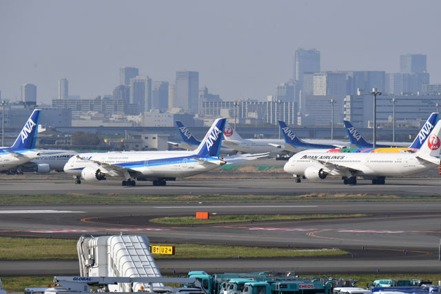 羽田空港に並ぶANAとJALの旅客機=20年4月4日 PHOTO: Tadayuki YOSHIKAWA/Aviation Wire