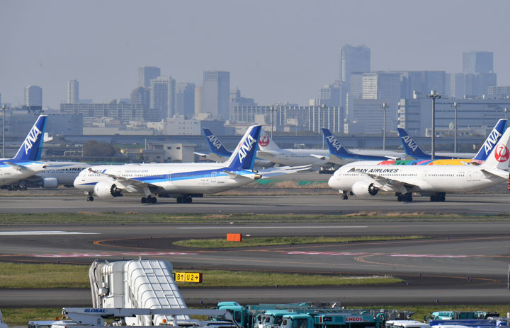 羽田空港に並ぶANAとJALの旅客機=20年4月4日 PHOTO: Tadayuki YOSHIKAWA/Aviation Wire
