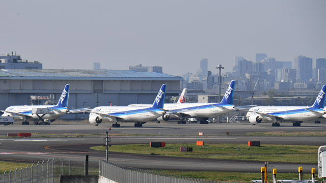 羽田空港に並ぶANAとJALの旅客機=20年4月4日 PHOTO: Tadayuki YOSHIKAWA/Aviation Wire