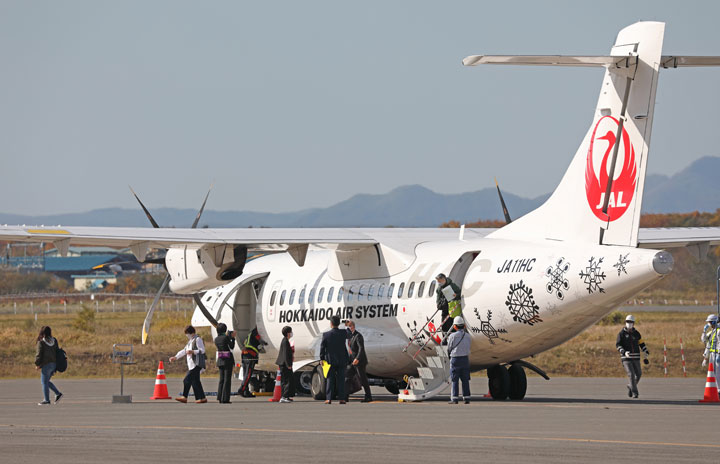 中標津空港へ戻った慰霊チャーターJL4364便から降機する元島民ら=20年10月21日 PHOTO: Stringer/Aviation Wire