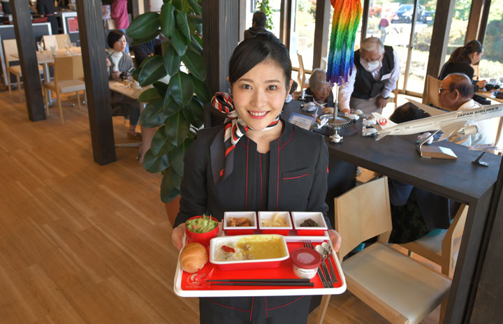 成田空港近くのレストラン「御料鶴」でエコノミークラスの機内食「イエローチキンカレーアジアンスタイル」を紹介するJALの客室乗務員=20年11月10日 PHOTO: Tadayuki YOSHIKAWA/Aviation Wire