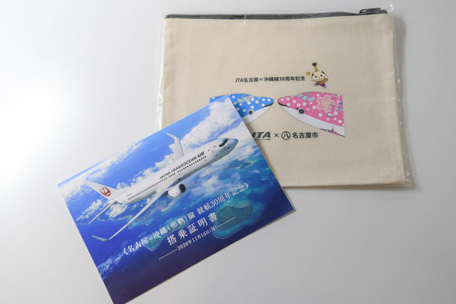 名古屋-那覇線就航30周年を記念しNU045便の乗客に配られた搭乗証明書と記念品=20年11月16日 PHOTO: Takayuki MURATA/Aviation Wire
