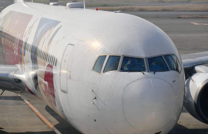 羽田空港を出発する「JAL DREAM EXPRESS FANTASIA 80」のコックピットから手を振るパイロット=20年11月18日 PHOTO: Tadayuki YOSHIKAWA/Aviation Wire