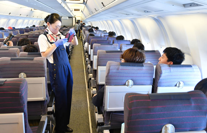 エア・ドゥの767初号機JA98AD最終便となった羽田行きHD20便の機内で乗客の記念撮影を手伝うサロペットの初代制服を着用した客室乗務員=21年1月20日 PHOTO: Tadayuki YOSHIKAWA/Aviation Wire