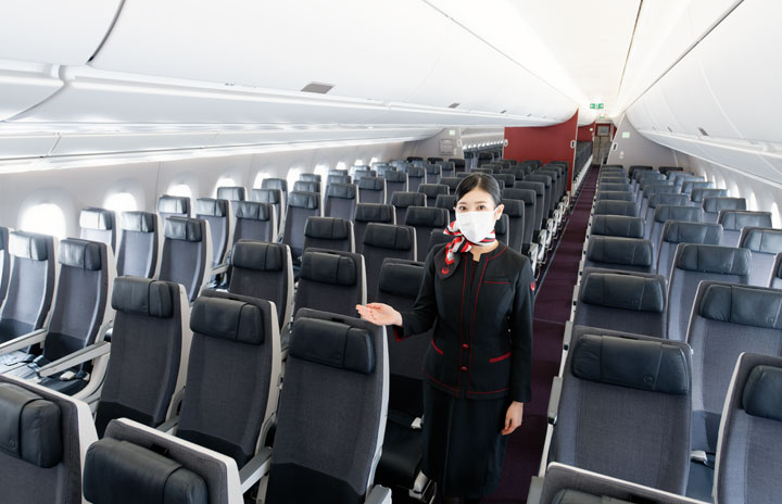 A350の普通席を紹介するJALの客室乗務員=PHOTO: Tadayuki YOSHIKAWA/Aviation Wire