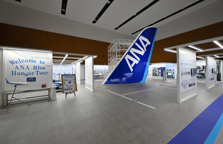 ANAがリニューアルする機体工場見学「ANA Blue Hangar Tour」で新施設として加わる体験型施設。中央は787の垂直尾翼の実物大模型=22年3月28日 PHOTO: Tadayuki YOSHIKAWA/Aviation Wire