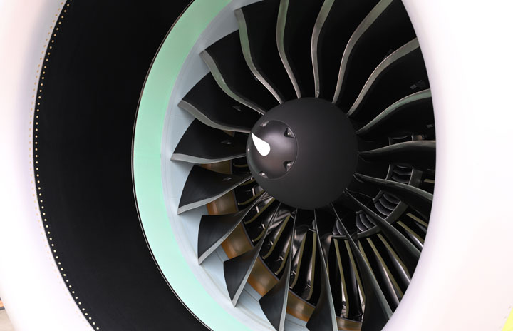 羽田空港で公開されたエア・バルティックのA220-300のエンジンPW1500G=22年5月9日 PHOTO: Tadayuki YOSHIKAWA/Aviation Wire